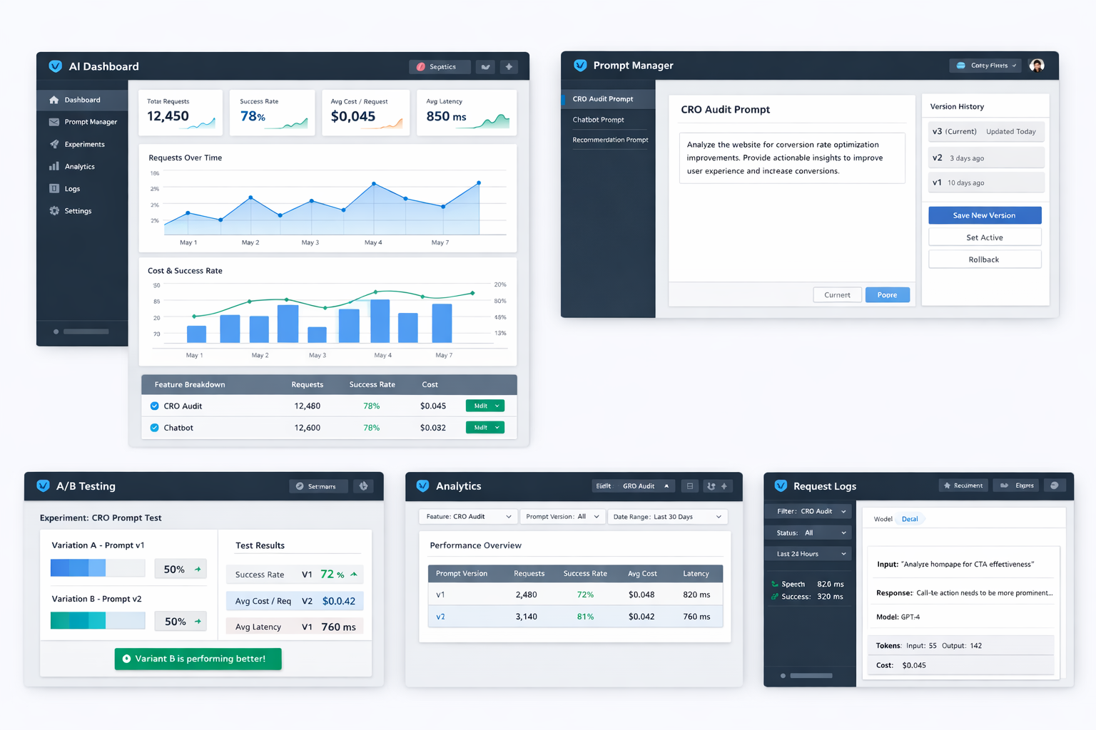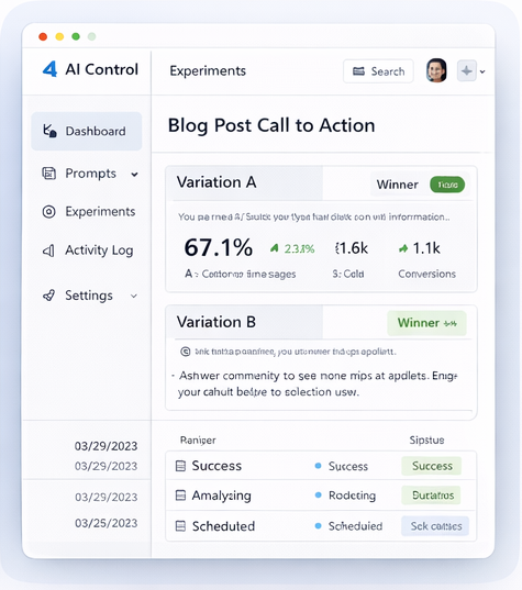 Run experiments, track performance, and connect AI usage to business outcomes โ all in one dashboard.